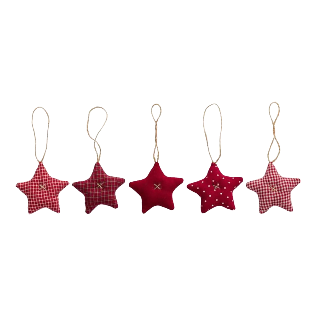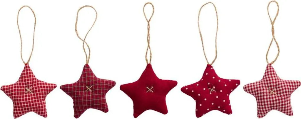 Es stehen 5 Stoffsterne mit individuellen Mustern im harmonischen Rottönen zur Auswahl