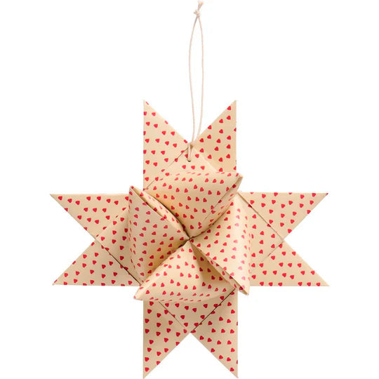 Dieser geflochtene Stern mit roten Herzen ist perfekt als Anhänger für den Weihnachtsbaum. Der geflochtene Stern ist aus Papier gefertigt und verleiht eine gemütliche und nostalgische Weihnachtsstimmung.
