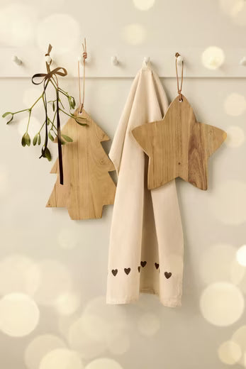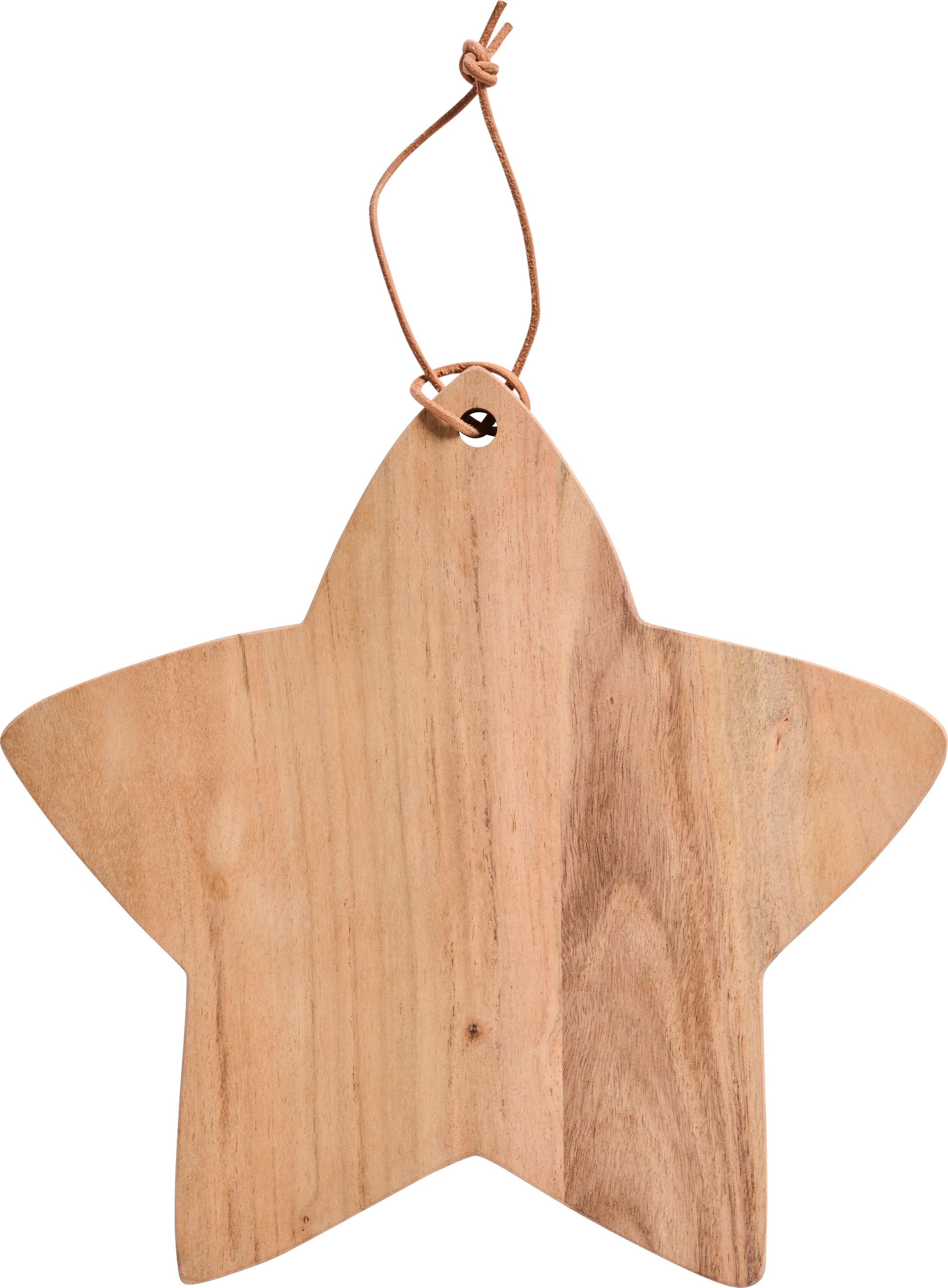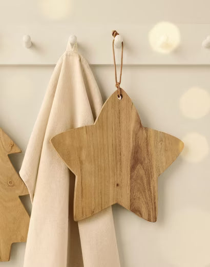 Sternförmiges Schneidebrett aus natürlich schönem Akazienholz mit praktischer Lederschnur zum Aufhängen – ein dekoratives Detail für die festliche Tafel zur Weihnachtszeit.