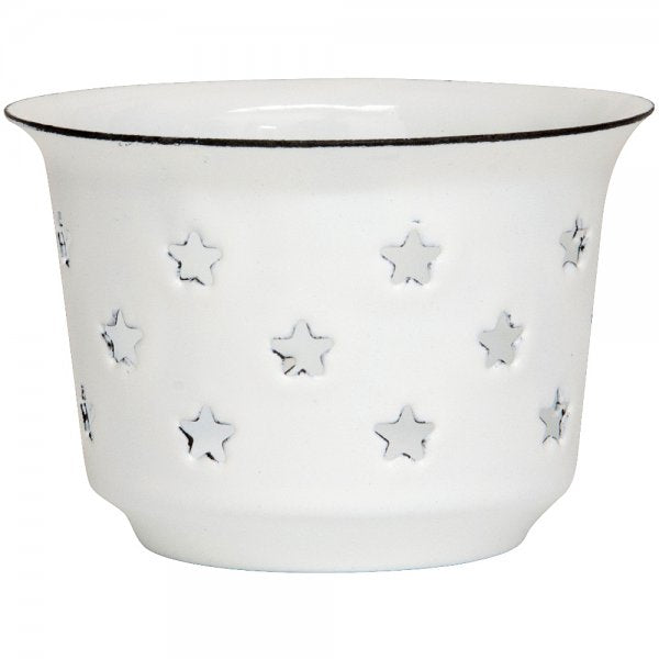 Stimmungsvolle Teelichthalter aus Emaille mit Herz-Ausschnitten – verbreitet warmes Licht und passt perfekt zu gemütlichen Ecken und Tischdekorationen.